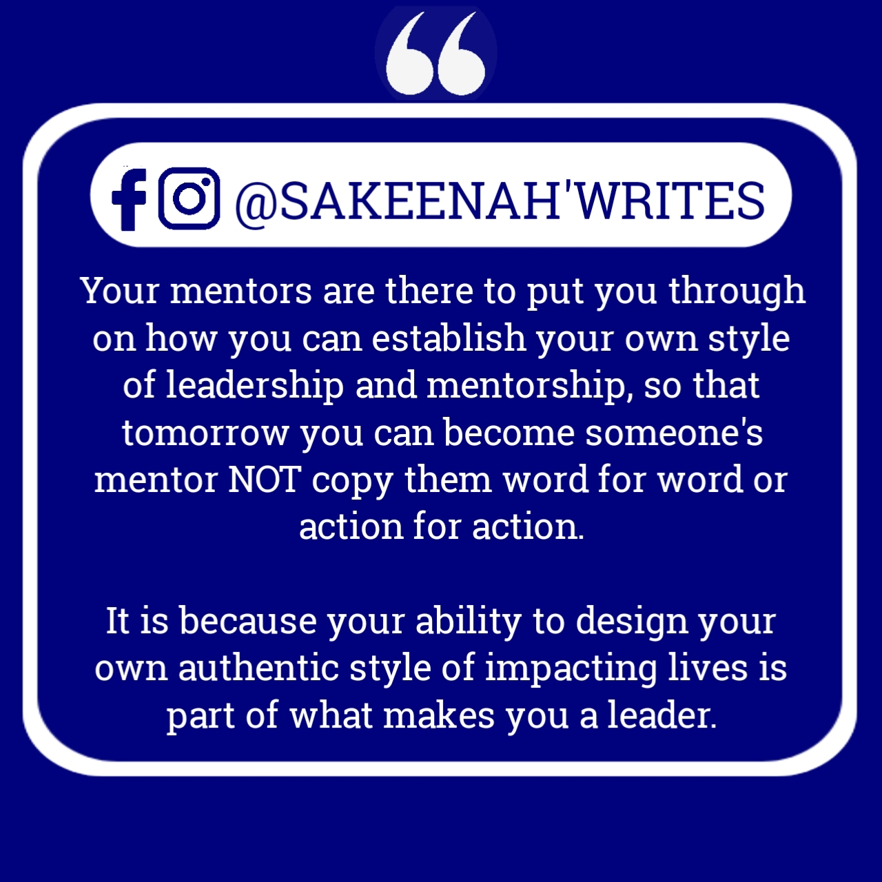 Your mentors are there to put you through on how you can establish your own style of leadership and mentorship, so that tomorrow you can become someone's mentor NOT copy them word for word or action for action.