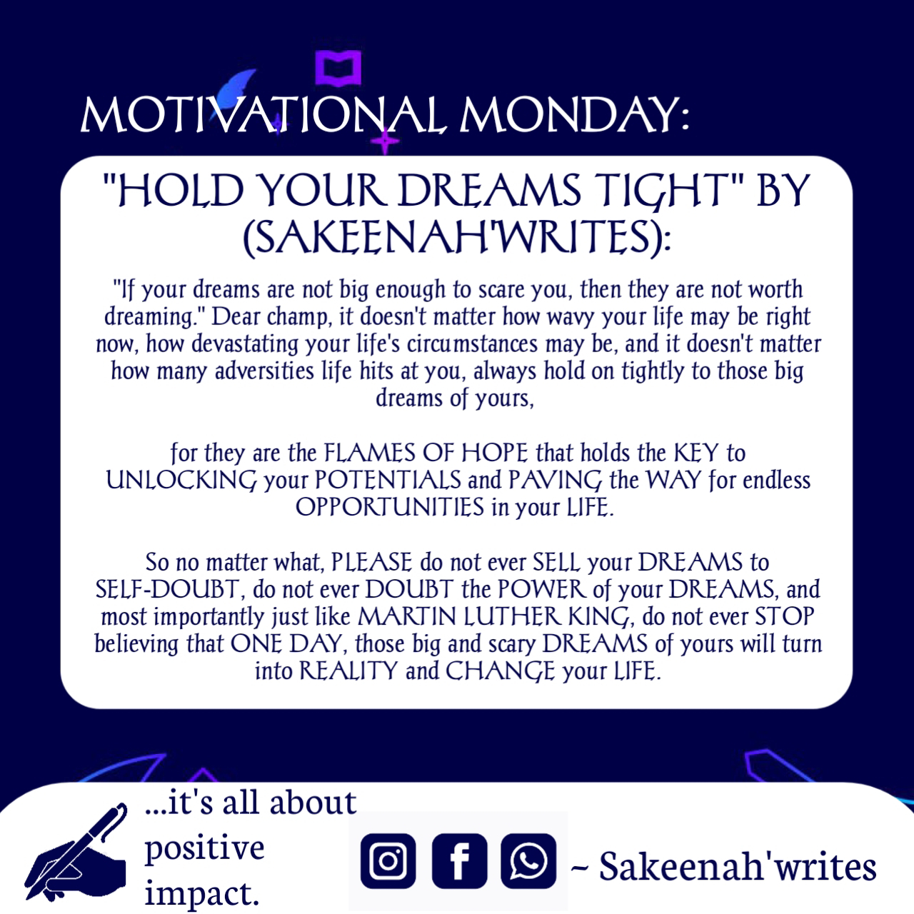 for they are the FLAMES OF HOPE that holds the KEY to UNLOCKING your POTENTIALS and PAVING the WAY for endless OPPORTUNITIES in your LIFE. So no matter what, PLEASE do not ever SELL your DREAMS to SELF-DOUBT, do not ever DOUBT the POWER of your DREAMS, and most importantly just like MARTIN LUTHER KING, do not ever STOP believing that ONE DAY, those big and scary DREAMS of yours will turn into REALITY and CHANGE your LIFE.